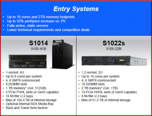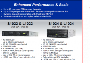 Deux autres modèles sont proposés et ne correspondent pas à l’entrée de gamme mais à des solutions offrant performance et croissance . Ce sont les S1022 et S1024. Ils permettent de disposer au maximum entre 40 et 48 cores sur deux processeurs et de 4 à 8 To de mémoire en fonction des modèles.
